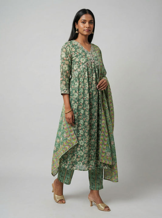 Green Floral Printed Cotton Suit Set with Coordinated Dupatta