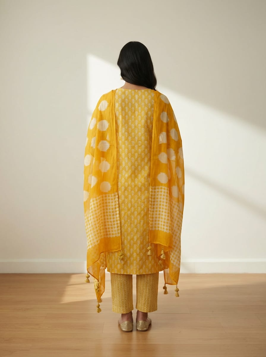Brighten your ethnic wardrobe with this elegant yellow cotton printed suit set, designed for effortless everyday style. Crafted from breathable cotton fabric, the kurta features delicate traditional prints with a minimal button neckline, giving it a graceful and timeless appeal.